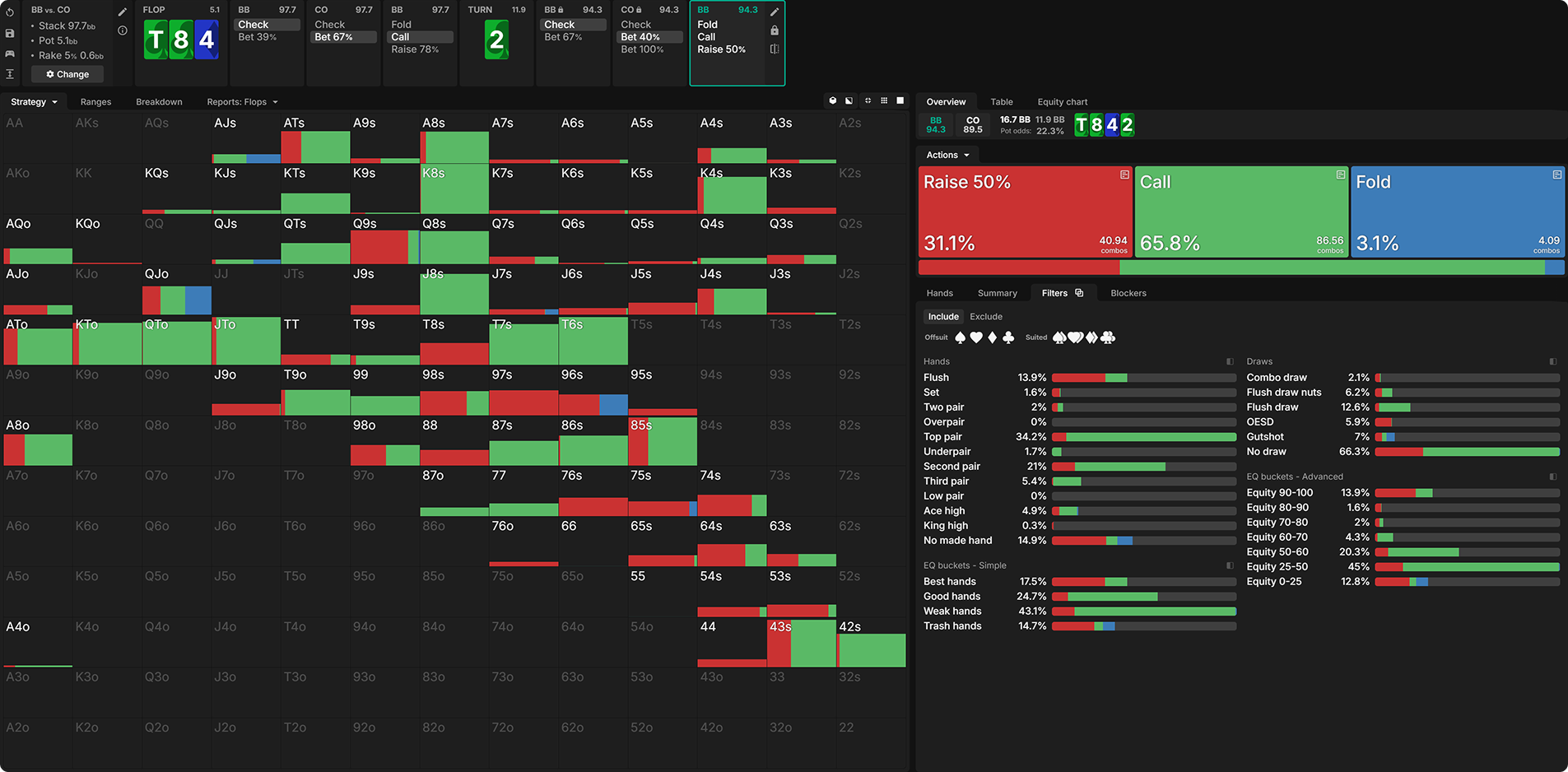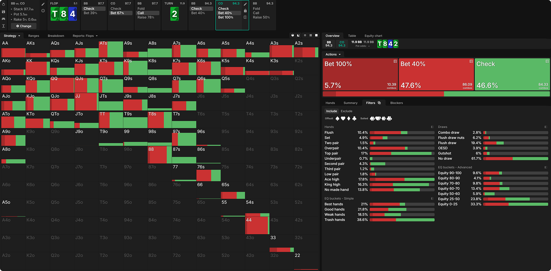 もしCOがフラッシュのときに大きめのサイズを選び、それ以外のレンジでは小さいサイズを使うという仮定が正しければ、BBの対応はその戦略に最適化する形で劇的に変化します。この仮定のもと、COのターンベットがポットの40%と100%の場合について、GTOレンジとエクスプロイトレンジの両方を比較しながら、BB側の対応がどう変化するのかを見ていきましょう。