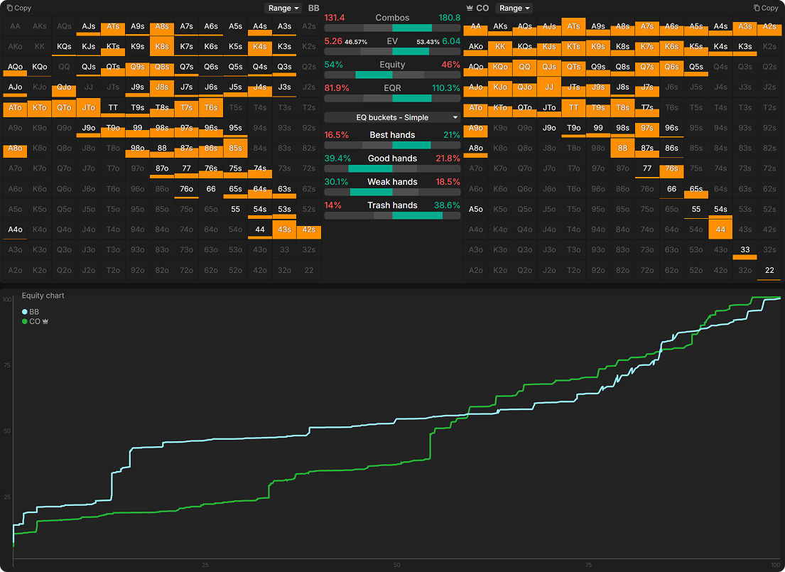 状況は次の通りです。COがオープンし、BTNが3ベット、スタックは100bbとします。COはディフェンス(コールまたはレイズ)するレンジのうち約40%というかなり大きな割合で、4ベットに回す必要があります。ここで重要なのはポジションです。OOPであることは先にアクションしなければならず、ポストフロップでエクイティを実現しにくくなります。