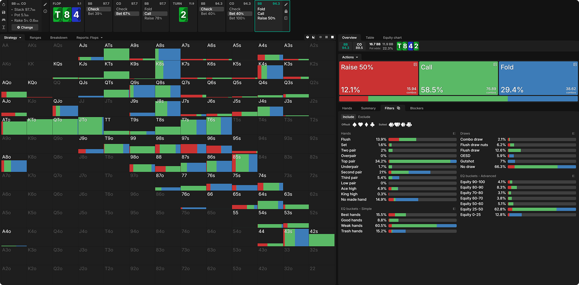 - より広く、よりリニアなレンジで3ベットの頻度を上げる:OOPが4ベットをあまり打たないため、3ベットラインでより多くのエクイティを実現できます。