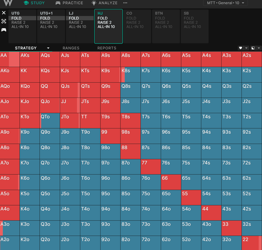 スタックが深くなると、下位のポケットペアやスーテッドコネクターに加えて一般的にインプライドオッズの高いハンドが好まれることがわかります。この状況では、スタックサイズの影響は少しですが、トーナメントではより顕著になります。