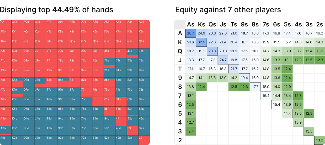 プレイヤーの数を調整する、つまりインプライドオッズの値を調整することで、GTOのオープンレンジとほぼ似たエクイティのグラデーションを作ることができました。たとえば、標準的な100BBのBTNのオープンレンジの隣に、上位44%のハンドのエクイティのグラデーションを表示してみます。