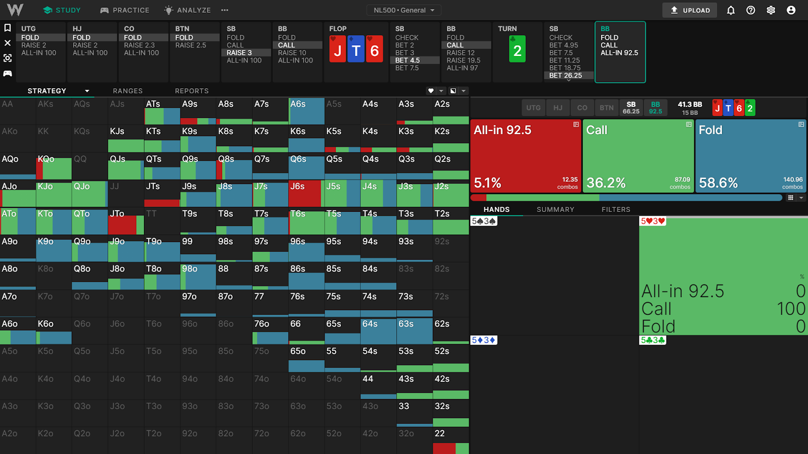 もしSBがターンでオールインするなら、簡単にフォールドすることができます。しかし、今回はコールしても66.25BBが残っています。そのため、インプライドオッズを考慮すると、5♥3♥はドローカードを引いたときに、現在のエクイティ以上の勝ち分が期待できます。