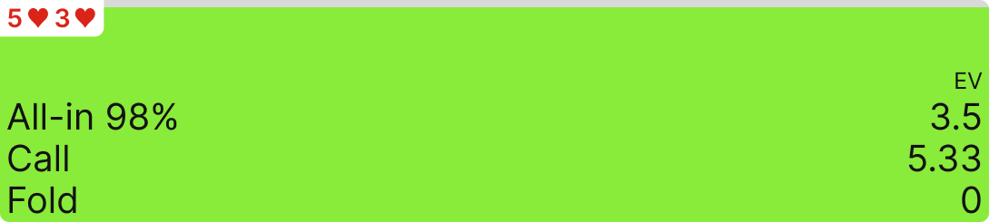 5♥3♥のEVはフォールドよりも5.33BB高くなっています。つまり、コールした後に(26.25BB + 5.33BB = 31.58BB)の勝ち分を期待できます。SBからのベットをコールした後のポットは67.5BBなので、期待できるポットシェアは(31.58 / 67.5) = 46.78%ポットです(レーキを無視した場合)。