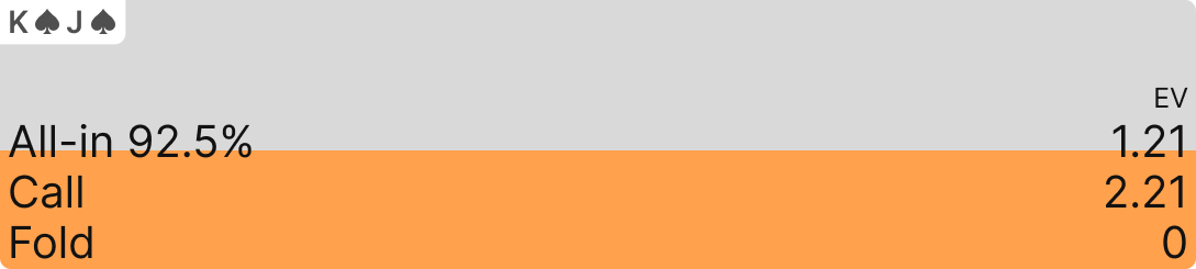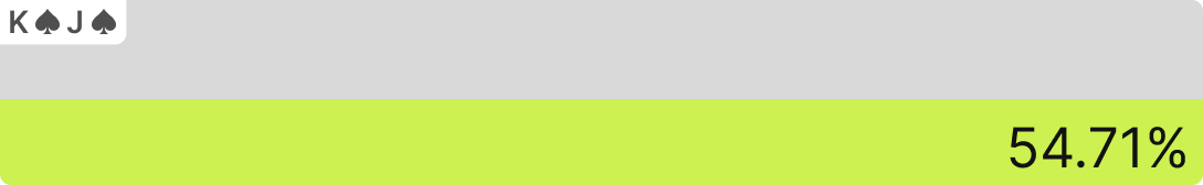 ここでも26.25BBを勝たないと収支が合わないので、K♠J♠は26.25 + 2.21 = 28.46BB、つまりポットの約28.46/67.5 = 42%を獲得する必要があります。