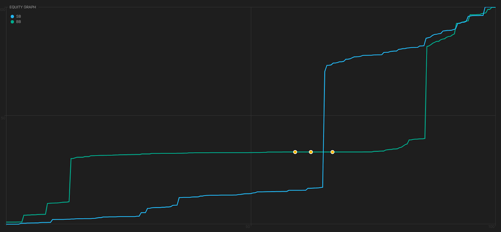 では、残りのEVはどこに行ってしまったのでしょうか?SBは自身のエクイティを十分に実現可能で、リバーでBBのトップペアをEVに差がない状況に追いやることができています。SBはより強いバリューとブラフのレンジでポラライズしたり、ハンドをまくったり、BBのトップペアをスタックして大きな利益を得ることができます。BBはSBのリバーでのベットに毎回コールするのは難しくなります。BBのレンジにはブラフキャッチャーのハンドがありますが、相手のレンジはとても強いため、こちらよりも弱いハンドからベットを引き出すことはできません。