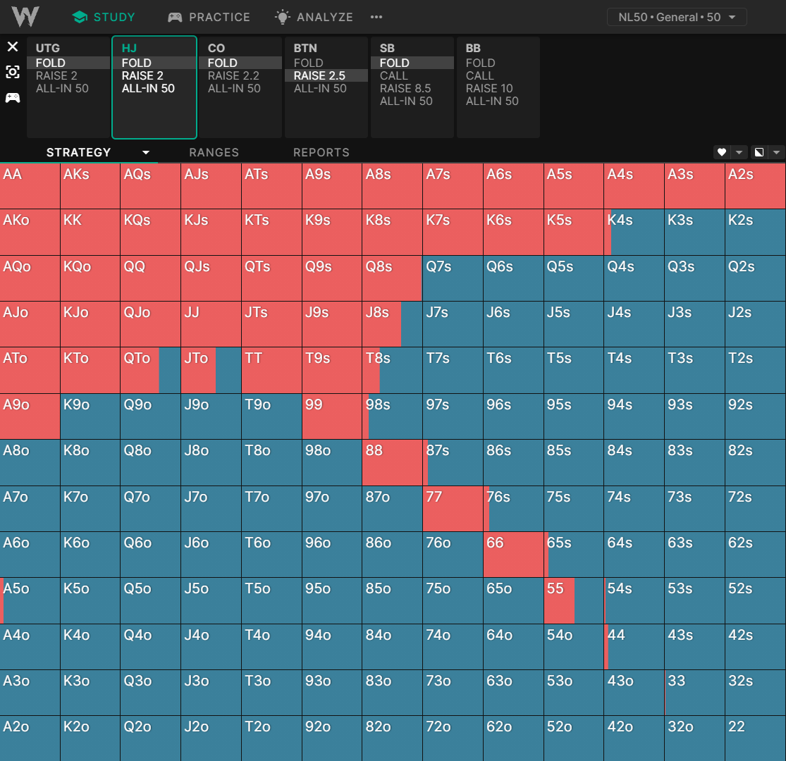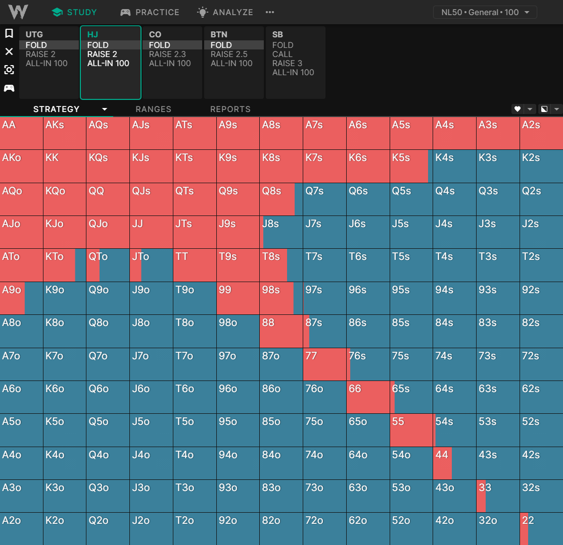 スタックが少ないときは高いエクイティがあるハンドでのオールインが好まれていますが、スタックが深いときにはインプライドオッズの高い「複数ストリートに渡ってプレイしやすい」ハンドへとレンジが広がっているのが見てとれます。60BB以上になると、インプライドオッズが高まり、他のプレイヤーがより広いレンジでポットに参加できるようになるため、レンジが少し狭くなります。