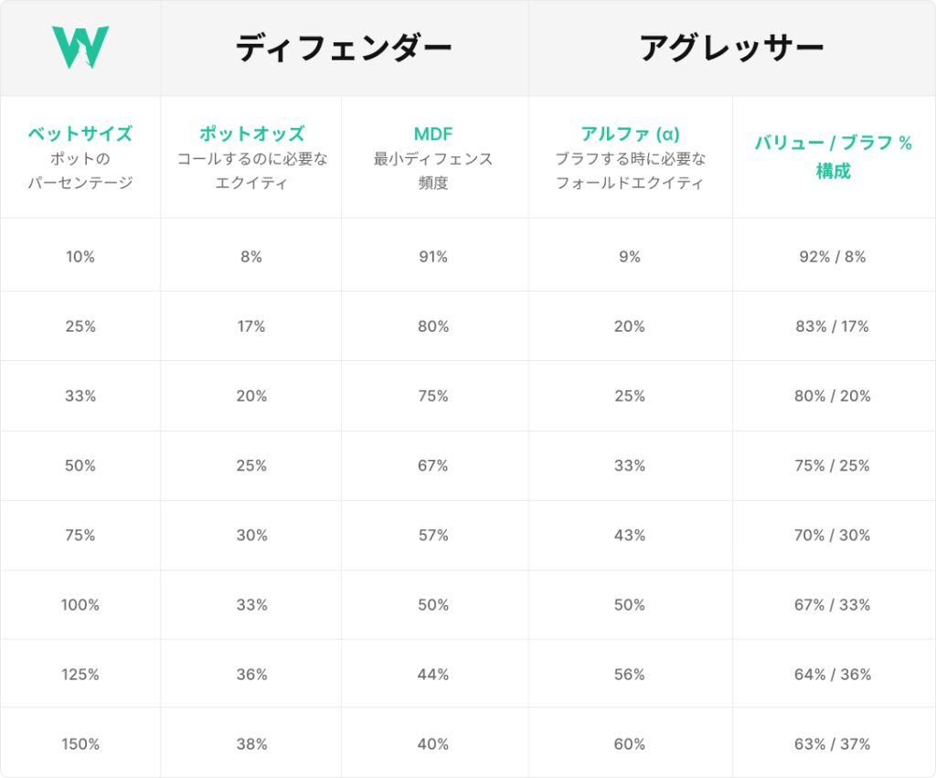 プレイ中に計算することが得意ではない人は、下記の表を覚えて使うことをおすすめします。ベットサイズの列とポットオッズの列を見ることで、どのくらいの確率で勝つ必要があるかがわかります。