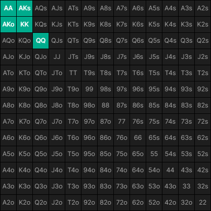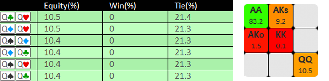 単純なエクイティ計算をすると、QQはKKやAKoよりもエクイティがかなり高いことがわかります。しかし、これはQQが20%以上の確率で他のQQとチョップしていることも高くなっている理由の1つです。