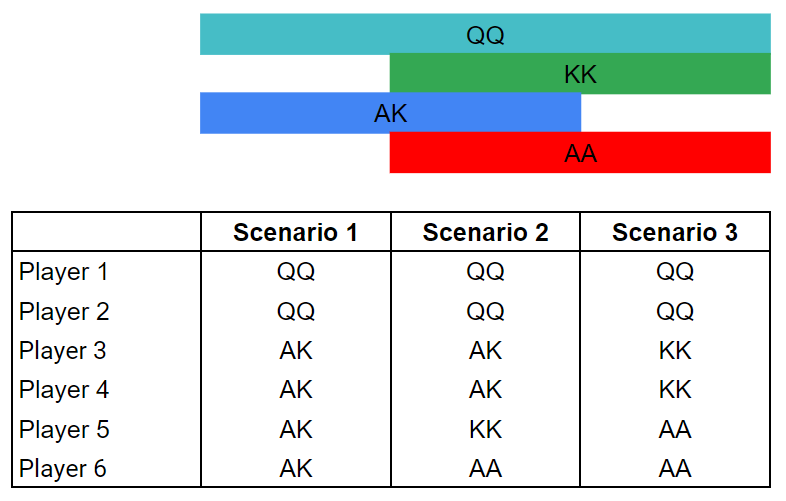 これらの質問に答えるために気づかなくてはならないことは、6人のプレイヤーが(QQ+, AK)の組み合わせになる可能性を考えることです。カード除去効果(あるカードを持っていることにより、残りのカードの組み合わせを限定させること)を考えると、それぞれの組み合わせは以下の通りです。