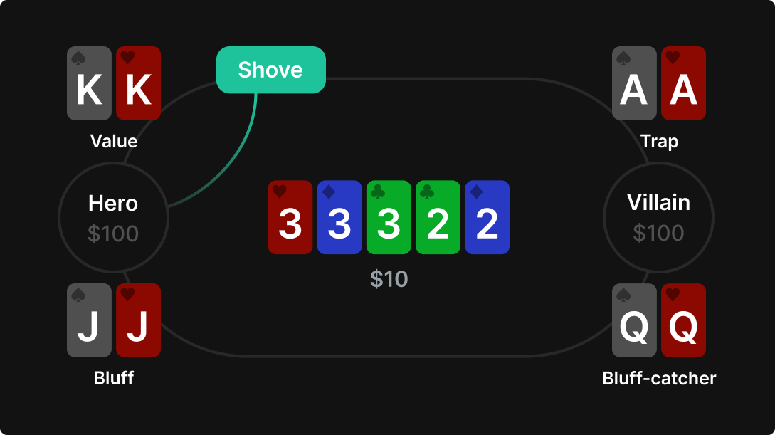 先ほどのポラライズ vs ブラフキャッチャーのトイゲームの計算方法がわかったところで、次はトラップ(バリューハンドより強いハンドのこと)がある場合について考えてみましょう。